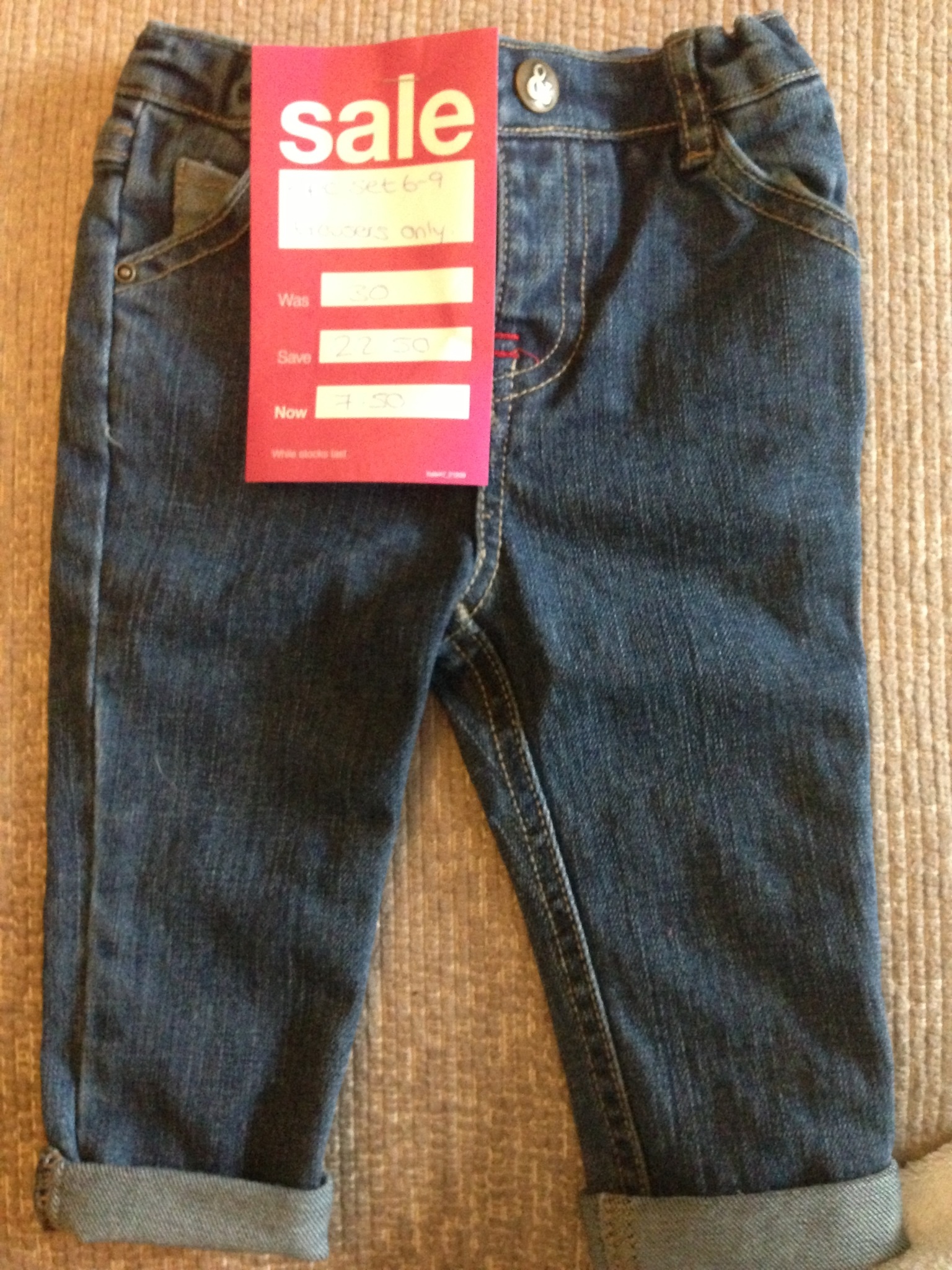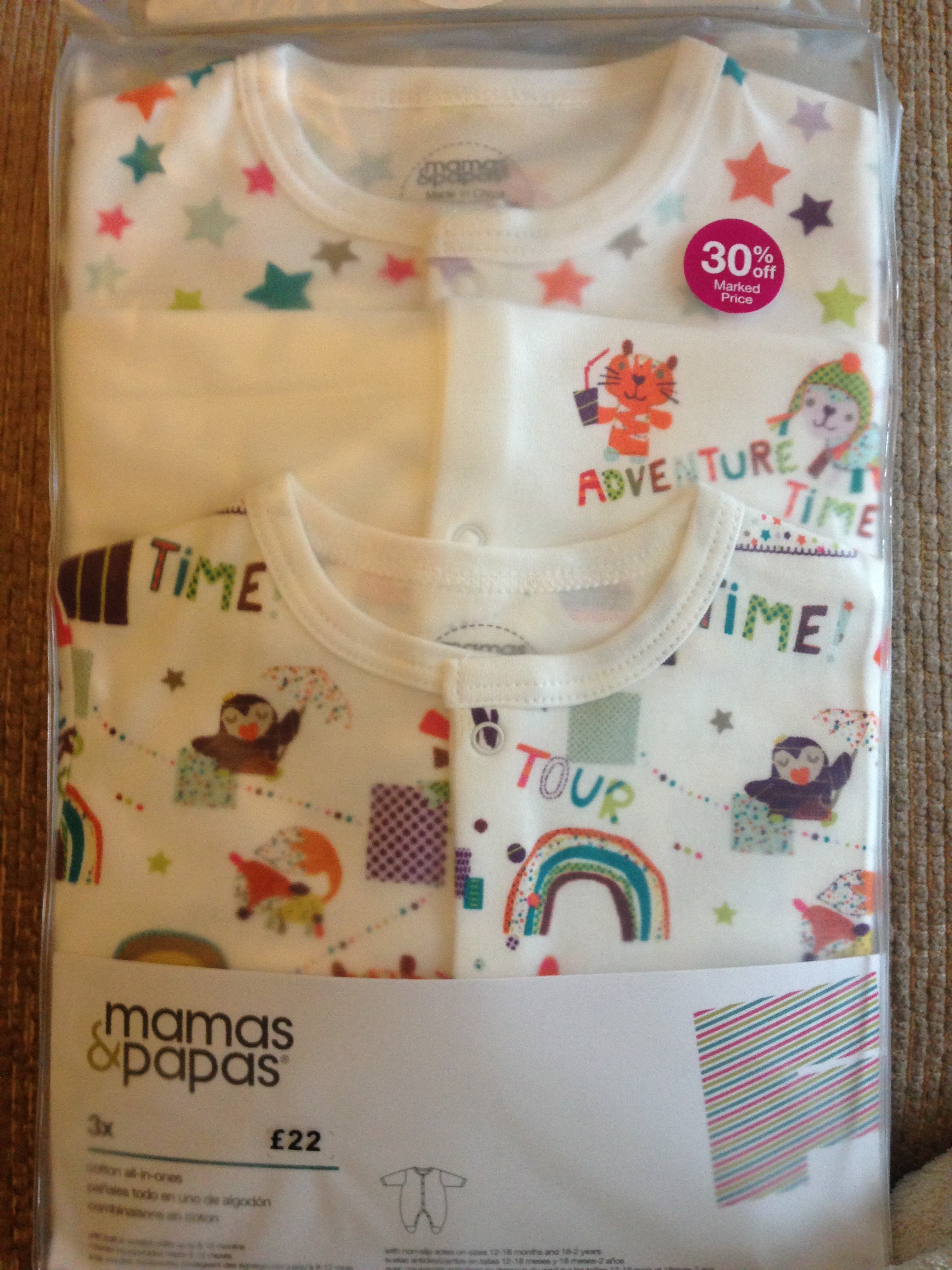 I love Mamas & Papas but I’ve never bought any clothes there as they’re pricey, so I was delighted to pick up a couple of bargains there last week…. Some cool sleepsuits that were 30% off (so about £15) and some jeans that were reduced from £30 to £7 as they were originally part of a set – W needed some new jeans and I love a bargain!