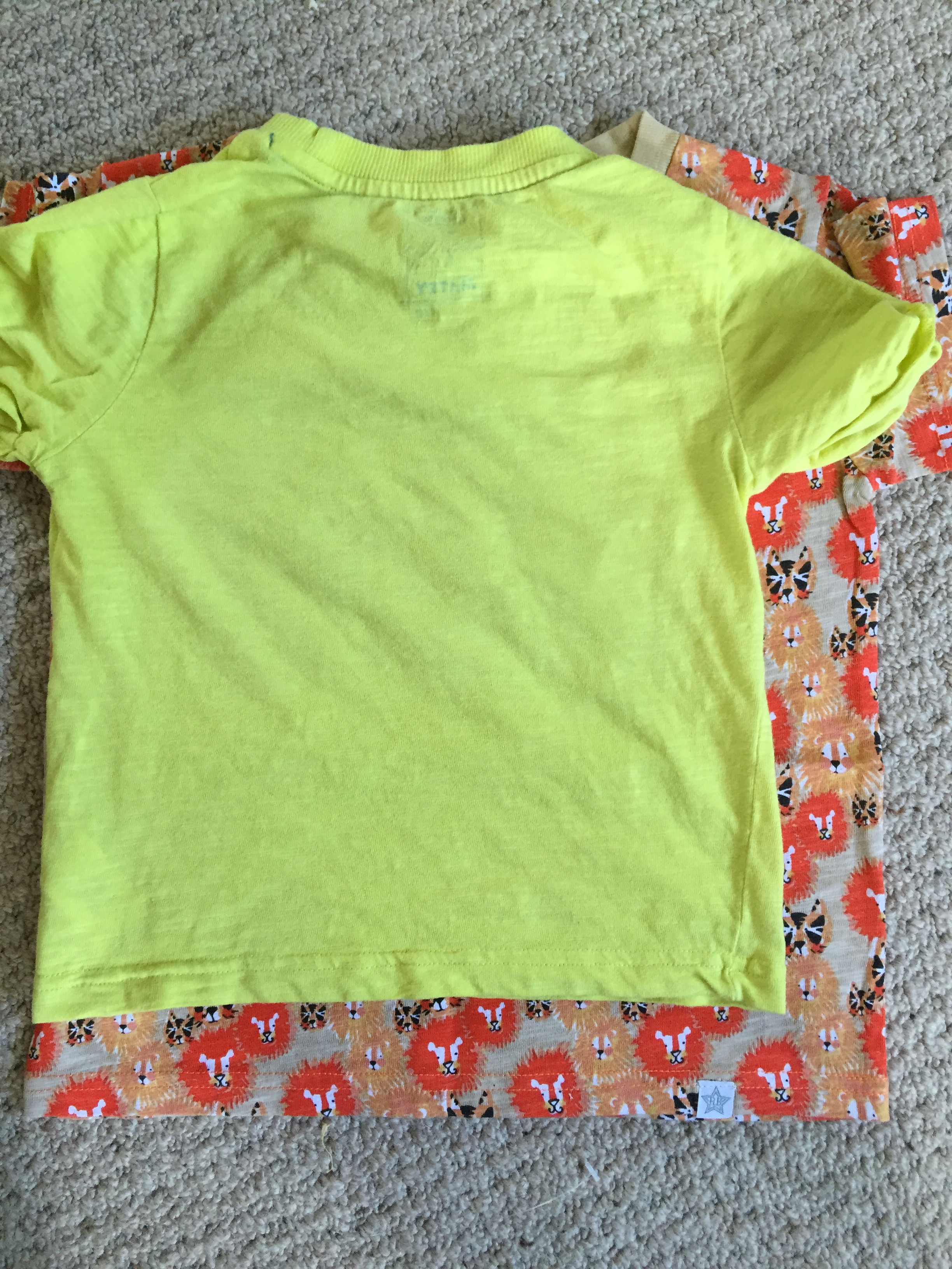 The t-shirt was too big overall, here it is overlaid with another t-shirt he wears age 2-3.