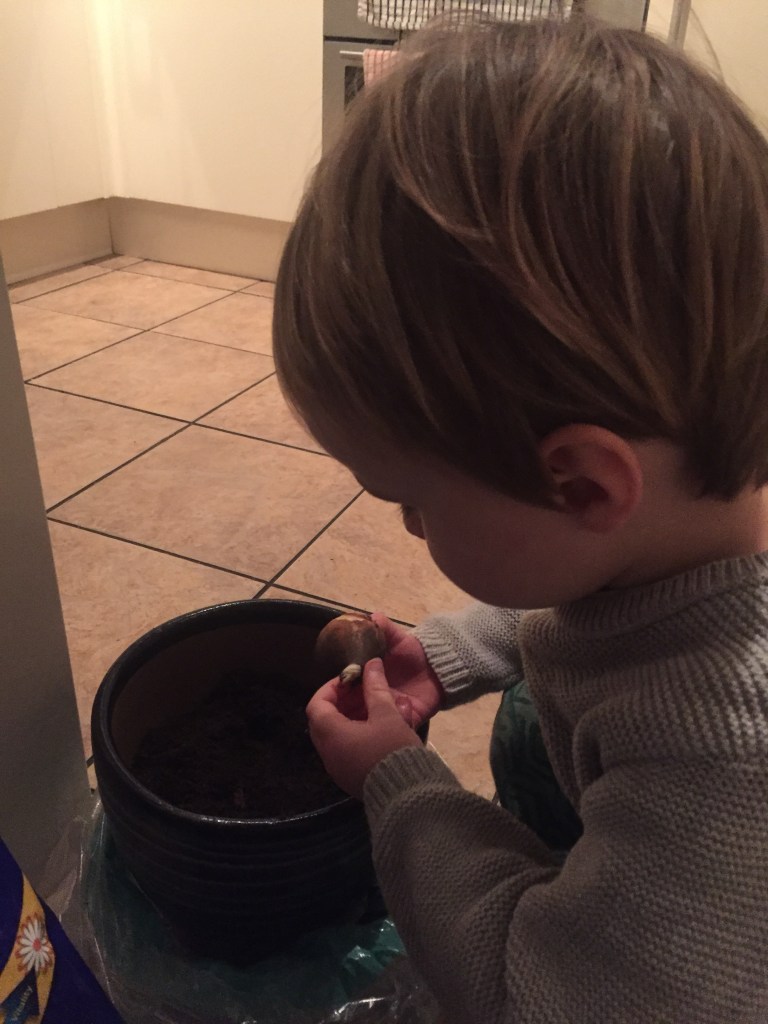 For now, I’ll have to make do with these ones… I got toddler W to help me plant them in a pot as a Christmas present for a special relative who loves tulips 🙂 He enjoyed helping but I’m not sure he quite gets the concept of it all yet!