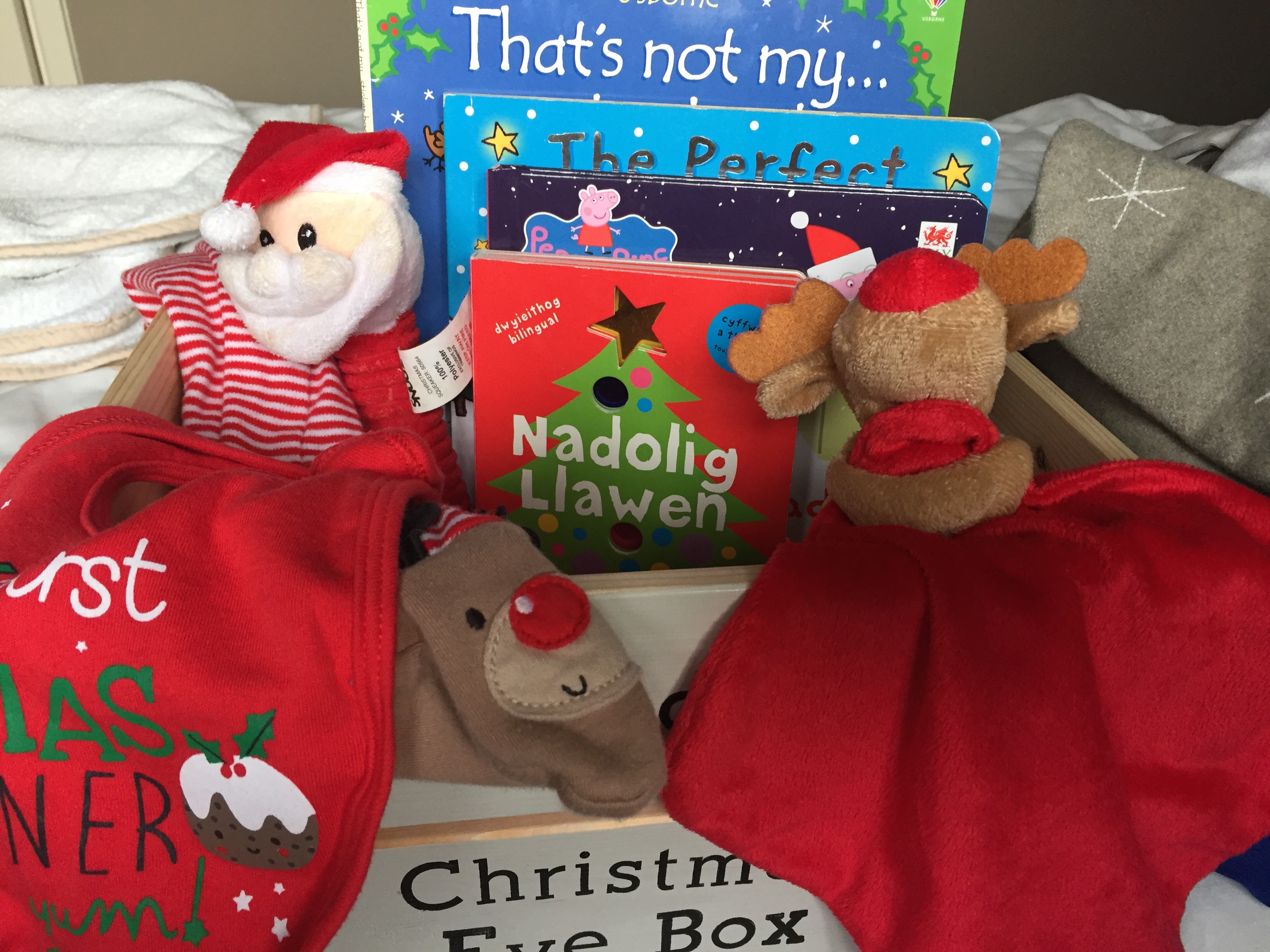 I bought the personalised box from a local lady. The boys have new PJs to wear tonight. My MIL bought them a plate for Santa’s mince pie, and we have some reindeer food. The rest of the box is made up of Christmassy gifts (rattle, comforter, bib for Sam, books for both) that W was given the last 2 Christmases… he won’t remember!