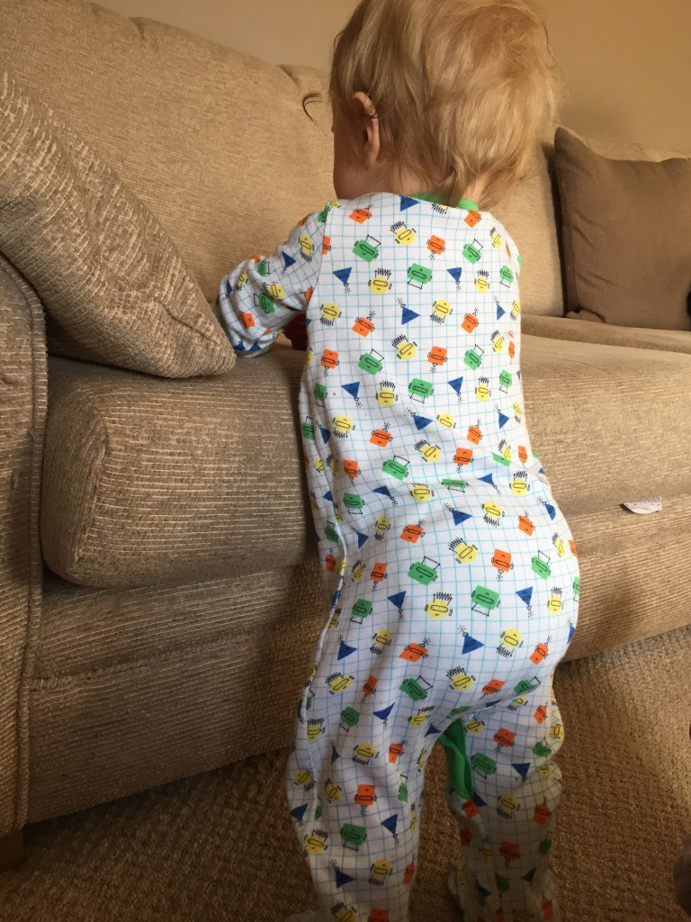 All these new skills he’s trying to do means his sleep has taken a backwards step. He’s only slept through once or twice this month – pretty much every night he’s woken at least a couple of times – sometimes a cwtch/foot rub/bottle can easily settle him, sometimes he’s been really unsettled. He’s always gone down to sleep quite easily after his bath and book but even that hasn’t been working so well this month – he’s a lot more clingy and often won’t nod off to sleep unless we stay in the room with him.